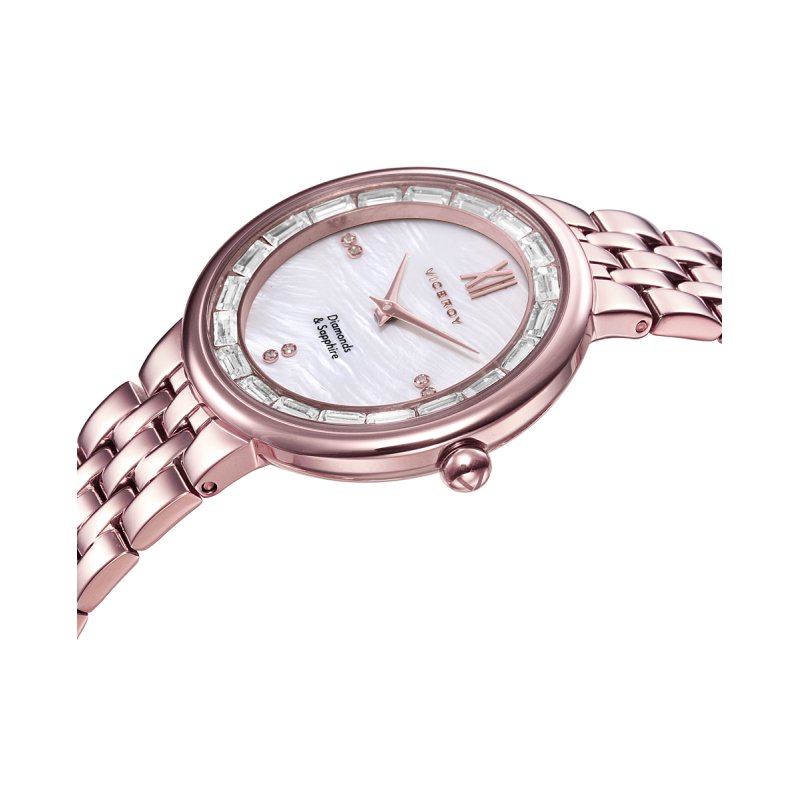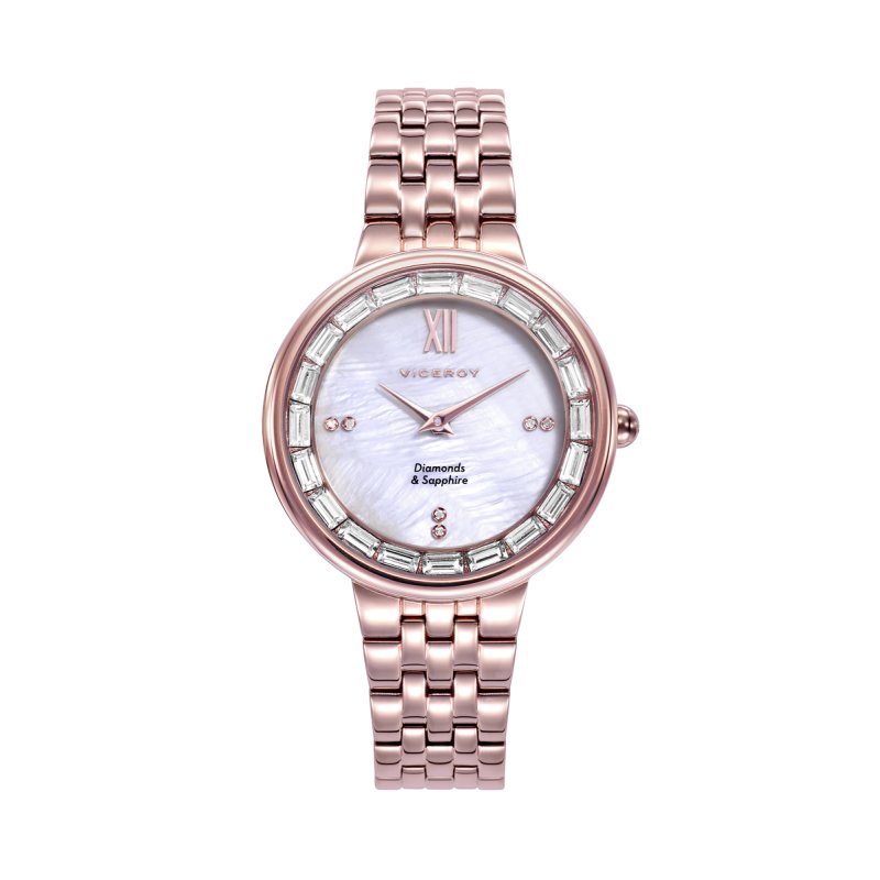 Esfera de madre perla blanca Índices (6 diamantes 0,9mm calidad I3) Agujas rosadas Cristal de zafiro Bisel interior adornado con brillantes Caja de acero inoxidable ip rosa Diámetro: 36 mm. Movimiento de cuarzo analógico Resistente al agua hasta 30m. Funciones: Hora y minutos Correa de acero ip rosa Cierre desplegable Edición limitada Incluye un estuche joyero rosado.