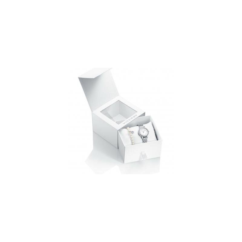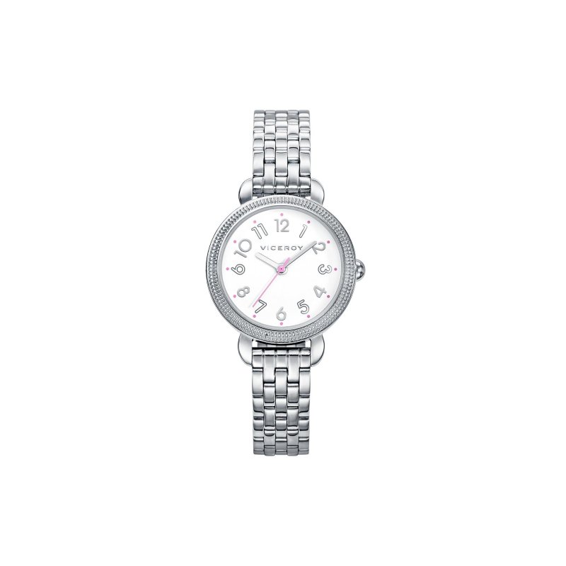 Esfera de color blanca Aguja y detalles de color rosa Caja de acero inoxidable Diámetro de la caja 26 mm Cristal mineral Movimiento de cuarzo analógico Resistente al agua hasta 30 m Funciones: Hora, minutos y segundos Brazalete de acero inoxidable Cierre desplegable Incluye pulsera de perlas de regalo