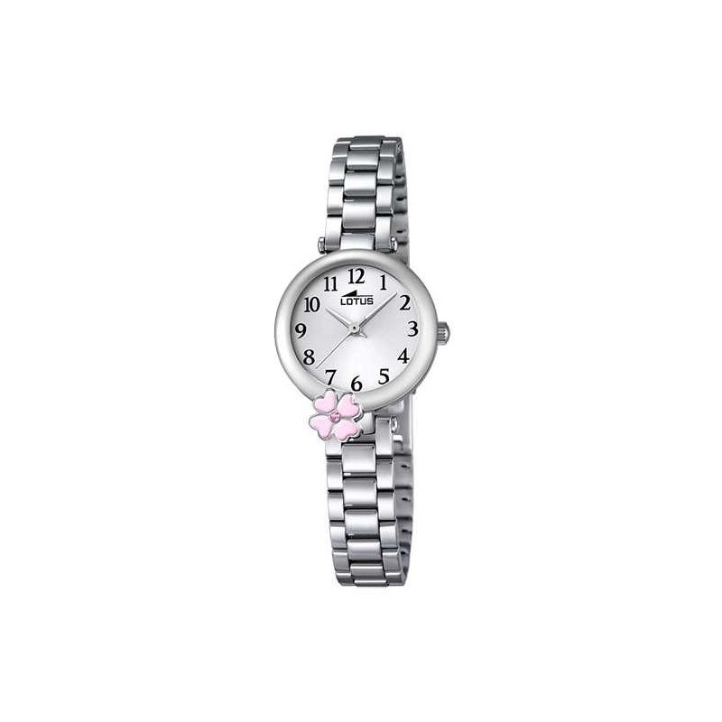 Esfera de color plateada Adornado con una flor de esmalte rosa y circonita Caja de acero inoxidable Diámetro: 24 mm. Cristal mineral Movimiento de cuarzo analógico Resistente al agua hasta 30m Funciones: Hora, minutos y segundos Brazalete de acero inoxidable Cierre desplegable Incluye estuche con pulsera de regalo.