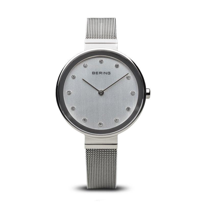 Esfera de color plateada y Swarovski Elements Caja de acero inoxidable Diámetro: 34 mm. Movimiento de cuarzo analógico Cristal de zafiro Resistente al agua hasta 3 ATM Funciones: Hora y minutos Correa de malla milanesa Cierre corredizo con pestaña de seguridad