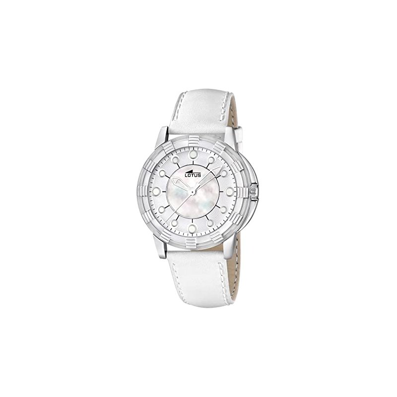 Esfera de color nacarado Índices y agujas luminiscentes Caja de acero inoxidable Cristal mineral Diámetro: 39mm Movimiento de cuarzo analógico Resistente al agua hasta 50 m. Funciones: Horas, minutos y segundos Correa de piel blanca Cierre de hebilla