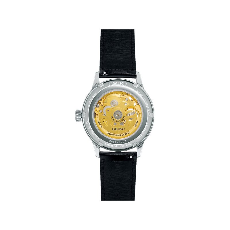Movimiento automático calibre 4R72 Con capacidad de carga manual Duración aprox. 41 horas Caja de acero inoxidable Diámetro: 40,5 mm Esfera de color crema Cristal Hardlex Resistencia al agua 50m Cierre desplegable con botón de apertura Brazalete de piel de becerro Función de parada del segundero Número de serie grabado en fondo de caja Fondo de caja transparente / Fondo de caja de rosca LIMITED EDITION en fondo de caja