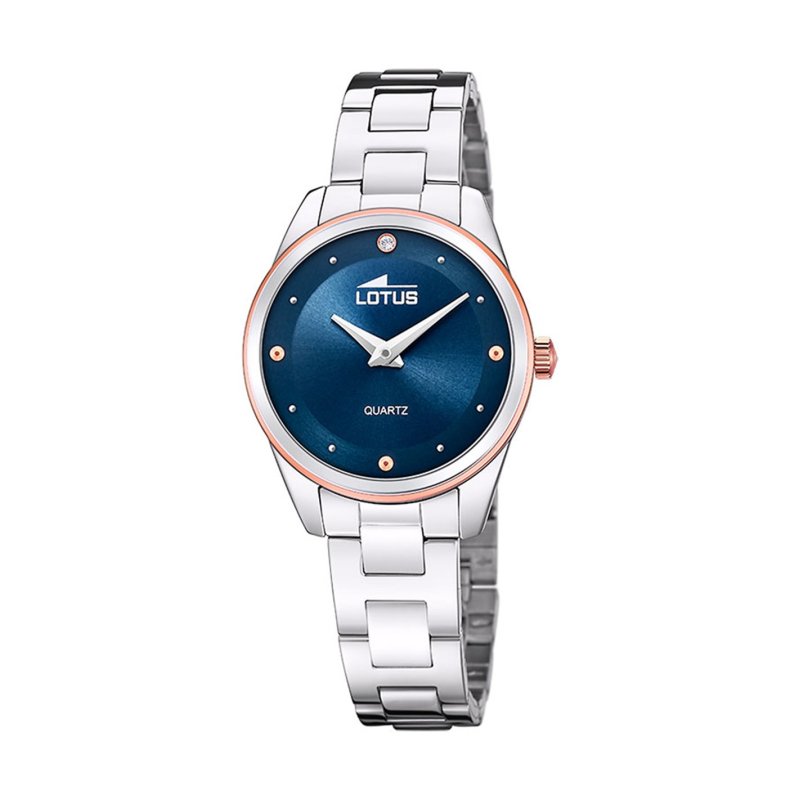 Esfera de color azul Caja de acero inoxidable Bisel y corona con detalles ip rosa Circonita en el índice de las 12 Cristal mineral Diámetro: 31 mm. Movimiento de cuarzo analógico Resistente al agua hasta 50 m. Funciones: Horas y minutos Correa de acero inoxidable Cierre desplegable con pulsador