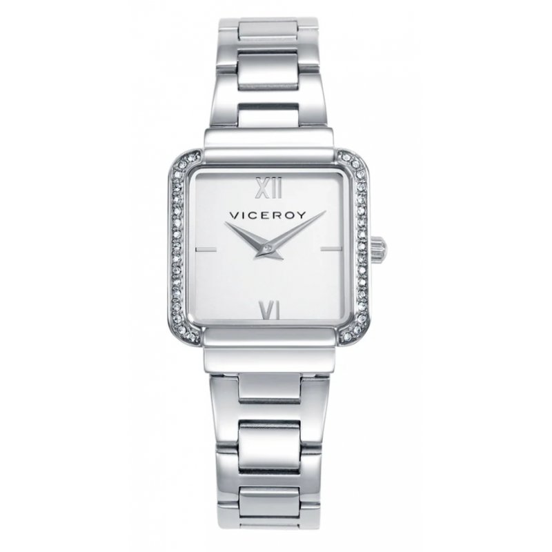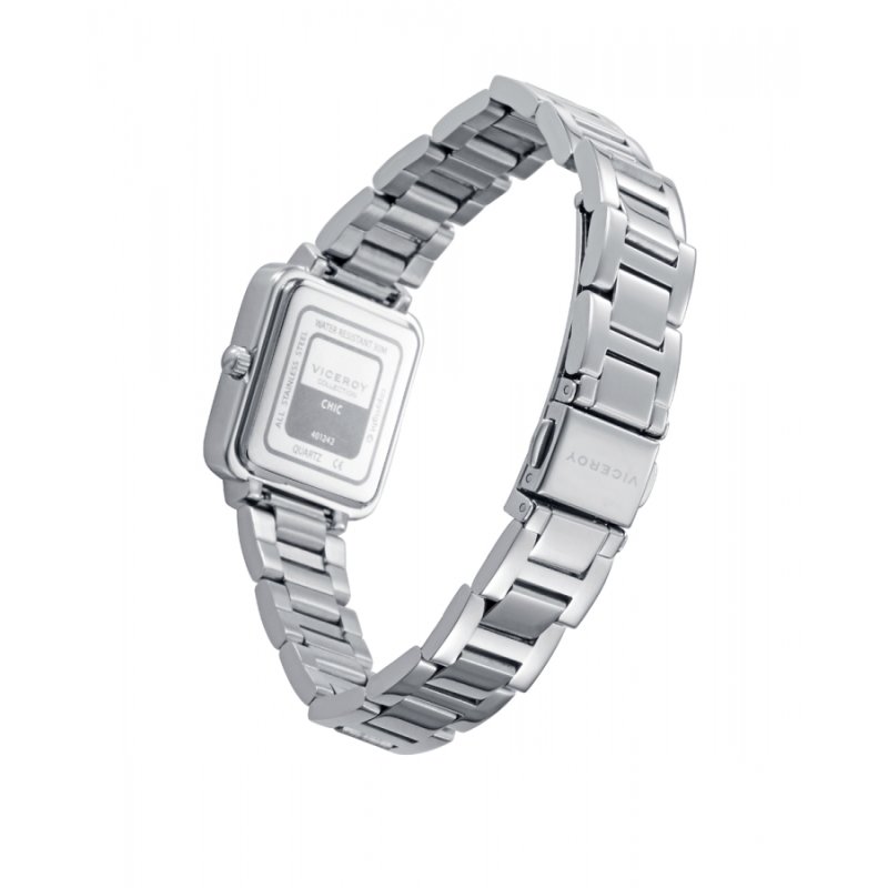 Esfera de color blanco Caja de acero inoxidable Bisel decorado con cristales en los laterales Medidas de caja: 26mm x 32,5mm (Alto x Ancho) Cristal mineral Movimiento de cuarzo analógico Resistente al agua hasta 50 m. Funciones: Horas, minutos y segundos Correa de acero inoxidable Cierre desplegable con pulsadores Coleccion Chic