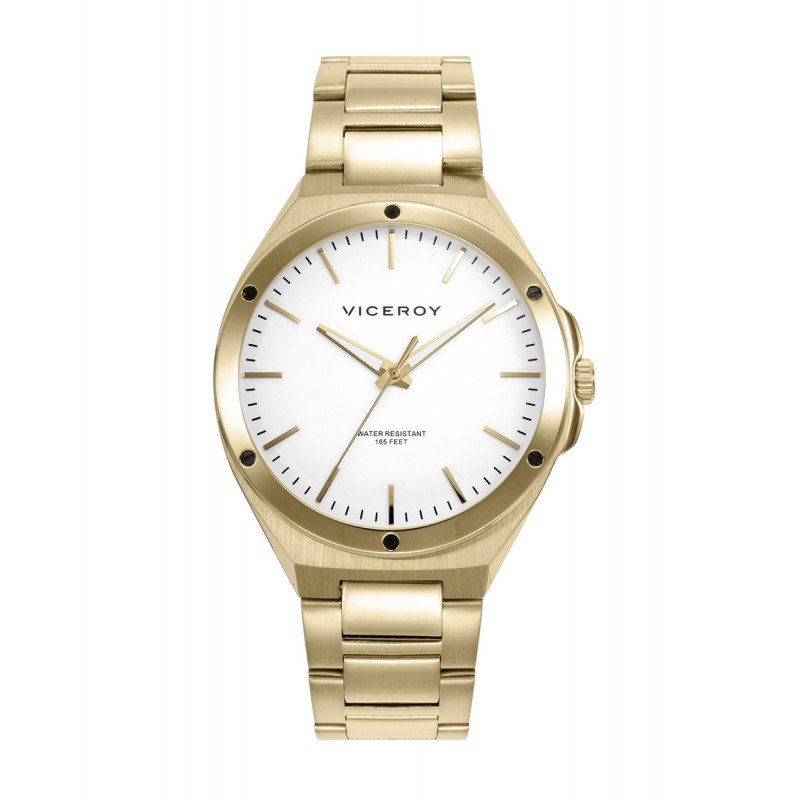 Esfera de color blanco Caja de acero inoxidable IP dorada Diámetro: 42 mm. Cristal mineral Movimiento de cuarzo analógico Resistente al agua hasta 50 m. Funciones: Horas, minutos y segundos Correa de acero inoxidable IP dorada Cierre desplegable con pulsadores Coleccion Dress