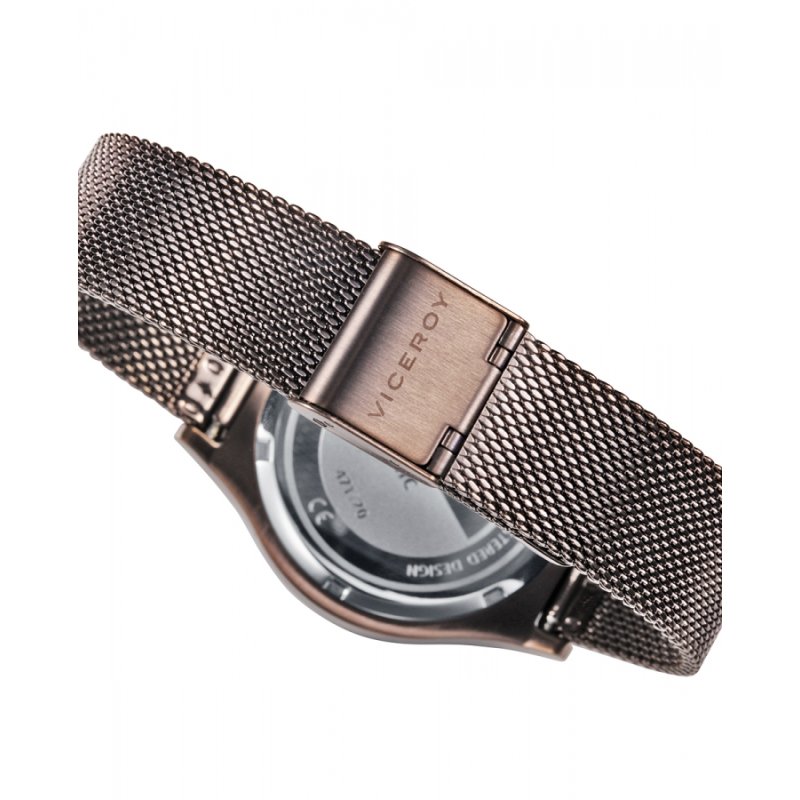 Esfera de color chocolate y rosa Índice y agujas rosados Bisel adornado con circonitas Caja de acero inoxidable ip marrón Diámetro: 37 mm. Cristal mineral Movimiento de cuarzo analógico Resistente al agua hasta 50m. Funciones: Hora, minutos y segundos Correa de malla milanesa ip marrón Cierre deslizante