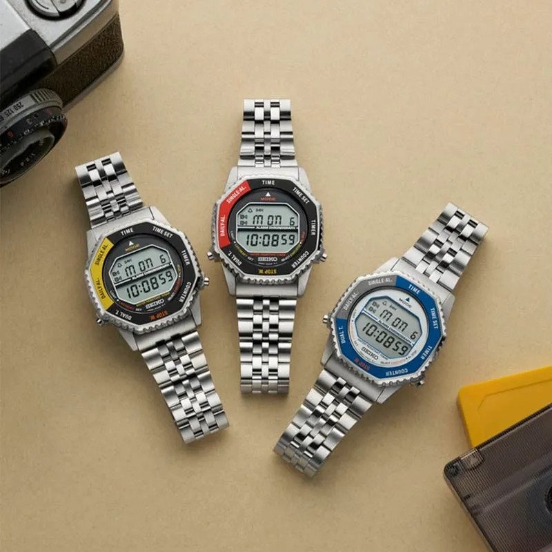 Movimiento Cuarzo calibre A824 Digital Caja de acero inoxidable Diámetro de caja: 37 mm Bisel giratorio de color rojo - negro (cambia las funciones) Cristal hardlex Resistencia al agua 100m Fondo de caja a rosca Calendario Interruptor giratorio Cronógrafo hasta 100 horas en incrementos de 1/100 de segundos Alarma Función Dual-Time Función de advertencia de duración de la batería Brazalete de acero inoxidable bicolor IP dorado Cierre de 3 pliegues con botón de apertura