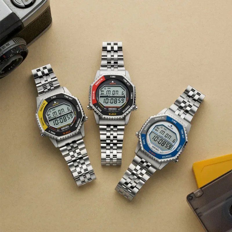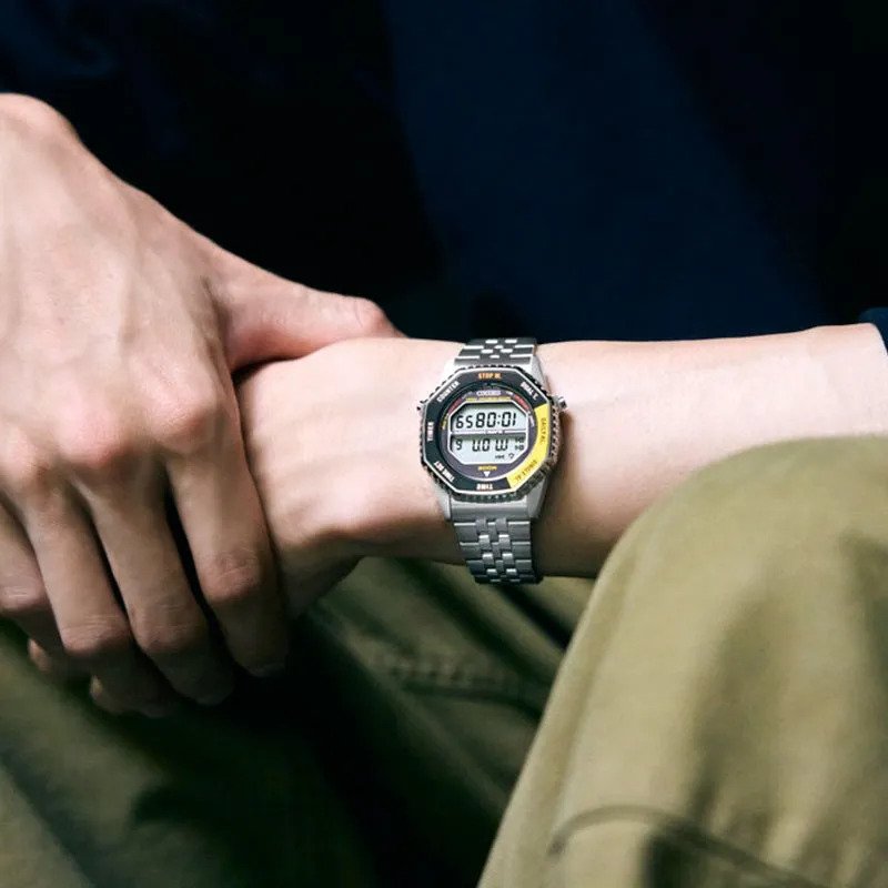 Movimiento Cuarzo calibre A824 Digital Caja de acero inoxidable Diámetro de caja: 37 mm Bisel giratorio de color amarillo - negro (cambia las funciones) Cristal hardlex Resistencia al agua 100m Fondo de caja a rosca Calendario Interruptor giratorio Cronógrafo hasta 100 horas en incrementos de 1/100 de segundos Alarma Función Dual-Time Función de advertencia de duración de la batería Brazalete de acero inoxidable bicolor IP dorado Cierre de 3 pliegues con botón de apertura