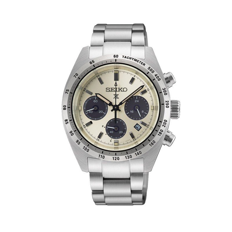 Movimiento de cuarzo solar calibre V192 Caja de acero inoxidable Diámetro de caja: 39 mm Cristal de zafiro curvado Cristal con revestimiento antirreflectante en la parte interna Esfera de color beige / negro Lumibrite en agujas e índice(s) Resistencia al agua 100m Cronógrafo hasta 60 min en incrementos de 1/5 de seg Función de prevención de sobrecarga Visualización de reserva de energia Visualización de la fecha Función de taquímetro Fondo de caja a rosca Corona a presión Brazalete de acero inoxidable Cierre de tres pliegues con botón de apertura LIMITED EDITION en fondo de caja Número de serie grabado en fondo de caja Edición limitada a 2.700 piezas