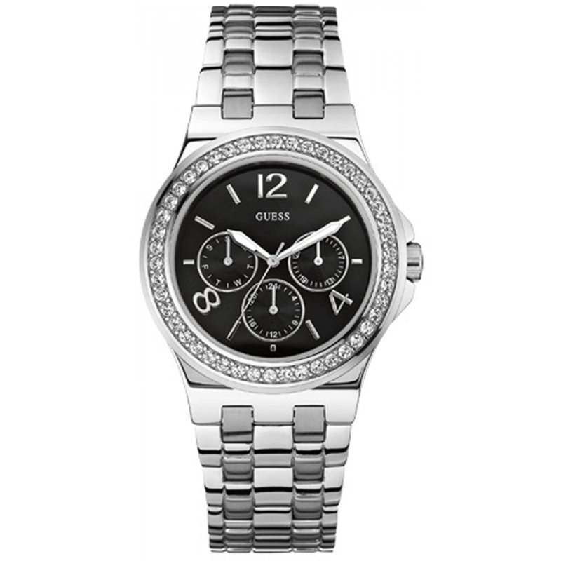 Esfera de color negra Caja de acero inoxidable Bisel decorado con cristales Índices y agujas plateados Diámetro: 38 mm. Movimiento de cuarzo analógico Resistente al agua hasta 30 m Funciones: Horas, minutos y segundos Indicador de día Indicador de fecha Reloj 24h Brazalete de acero inoxidable Cierre desplegable