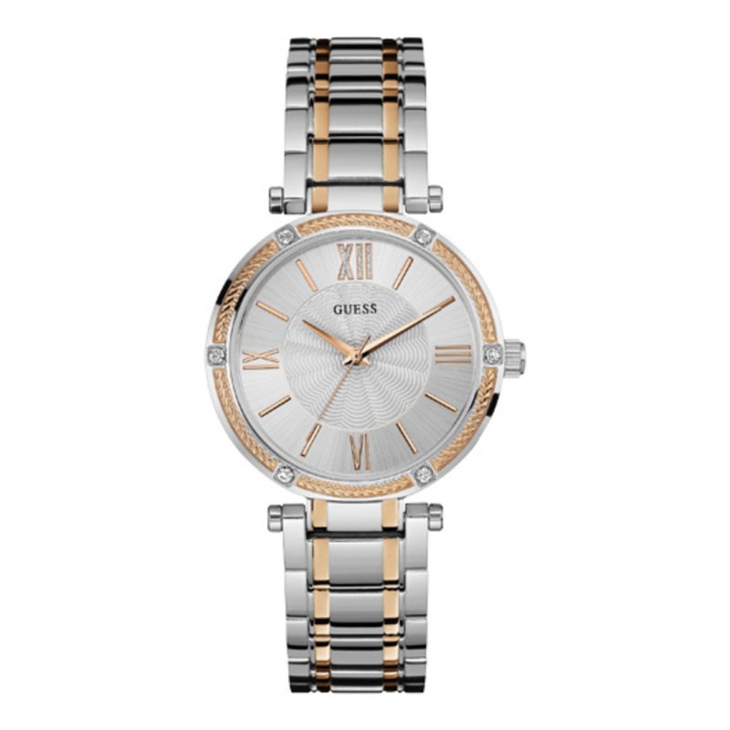 Esfera de color blanca Caja de acero inoxidable bicolor Bisel decorado con cristales Índices y agujas rosadas Diámetro: 36 mm. Movimiento de cuarzo analógico Resistente al agua hasta 30 m Funciones: Horas, minutos y segundos Brazalete de acero bicolor Cierre desplegable