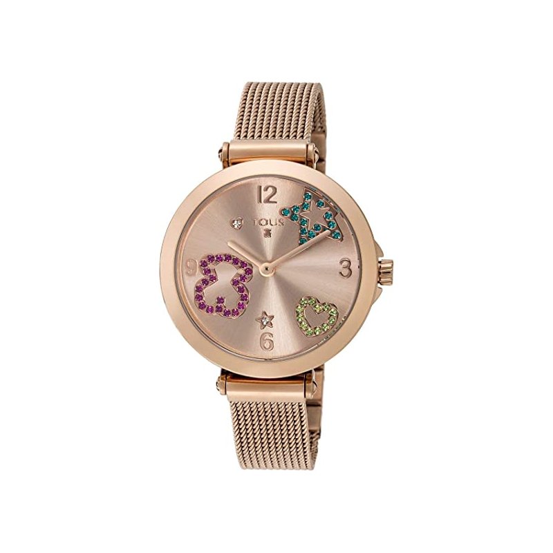 Caja de acero inoxidable IP rosado Diámetro: 33 mm. Esfera IP Oro Rosado con cristales Movimiento de cuarzo analógico Cristal mineral Resistente al agua hasta 50m Funciones: Hora y minutos Correa de acero inoxidable IP rosado Cierre de joyería Colección Icon Mesh de Tous