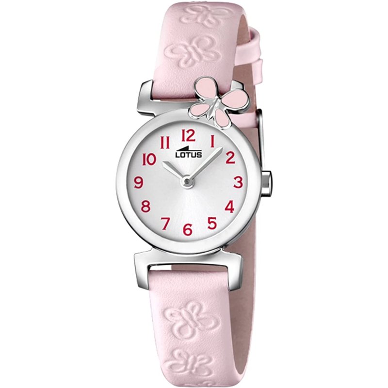 Esfera de color plateada Caja de acero inoxidable Cristal mineral Diámetro: 24 mm. Movimiento de cuarzo analógico Resistente al agua hasta 50 m. Funciones: Horas, minutos y segundos Correa de piel rosa Cierre de hebilla Incluye estuche con pulsera de regalo